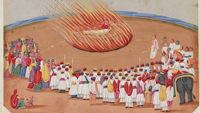 The Bride Throws Herself on Her Husband's Funeral Pyre. This miniature painting originates from the period of the Safavid dynasty, first half 17th century. (Attributed to the painter: Muhammad Qasim)